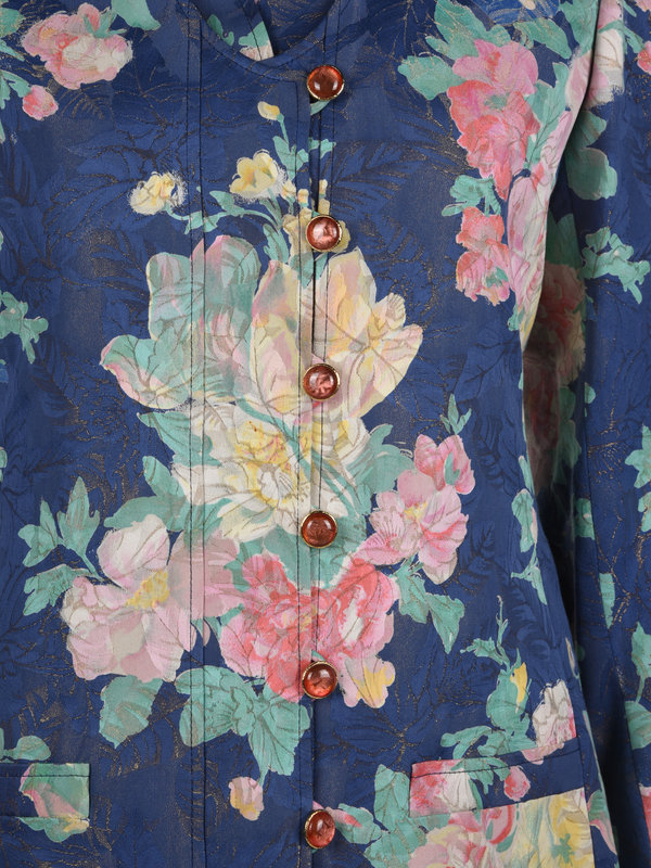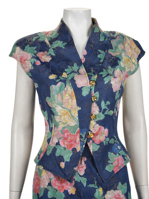 Three-piece blue floral jacquard skirt suit including a box neck jacket with front hip patch pockets and front button closure; paired with matching matching built up neckline, cap sleeve vest with back waist cinch, and front button closure, and matching pencil skirt with a side zip closure.