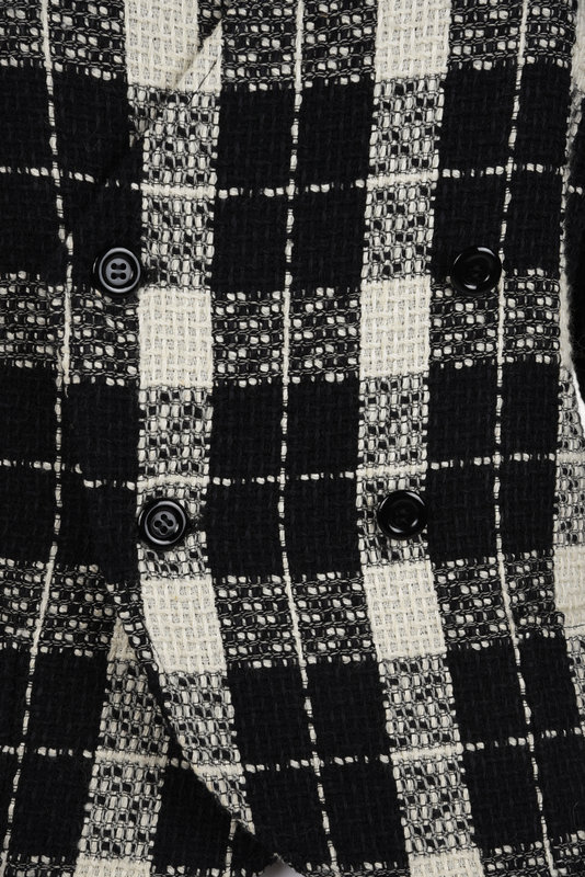 Black and white plaid tweed double breast jacket with clean neckline, short-sleeves, and front button closure.
