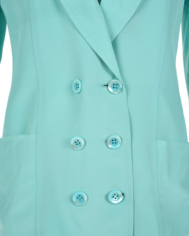 Two-piece crepe skirt suit including a light blue double breast blazer with shawl collar, hip patch pockets, and front button closure; paired with a pleated light mint green skirt with a side zip closure.