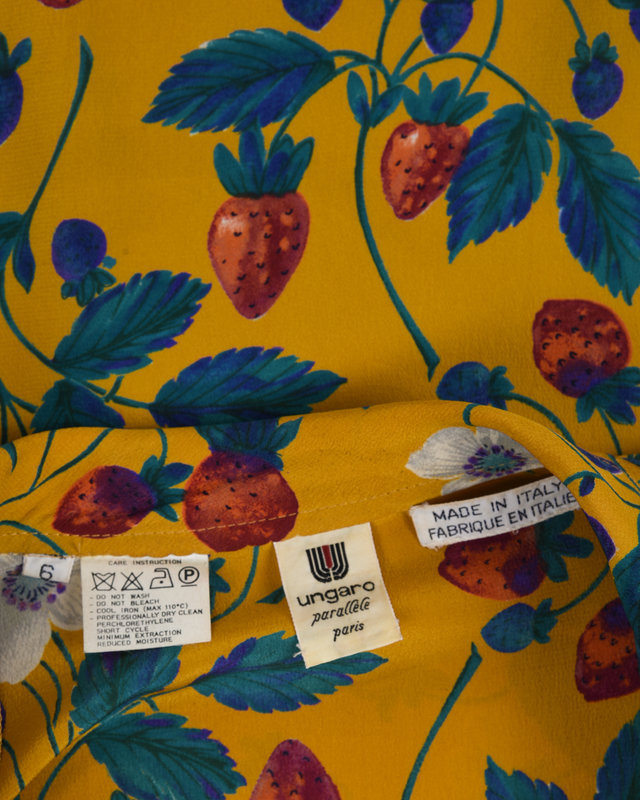 Yellow crepe button-down collared blouse with a strawberry print pattern featuring zippers at the cuff, patch pockets, and shoulder pads.