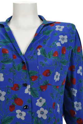 Blue crepe button-down collared blouse with a strawberry print pattern featuring zippers at the cuff, patch pockets, and shoulder pads.