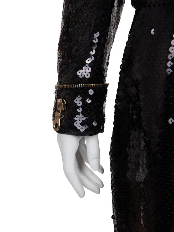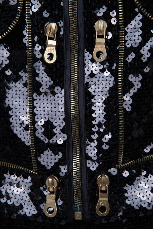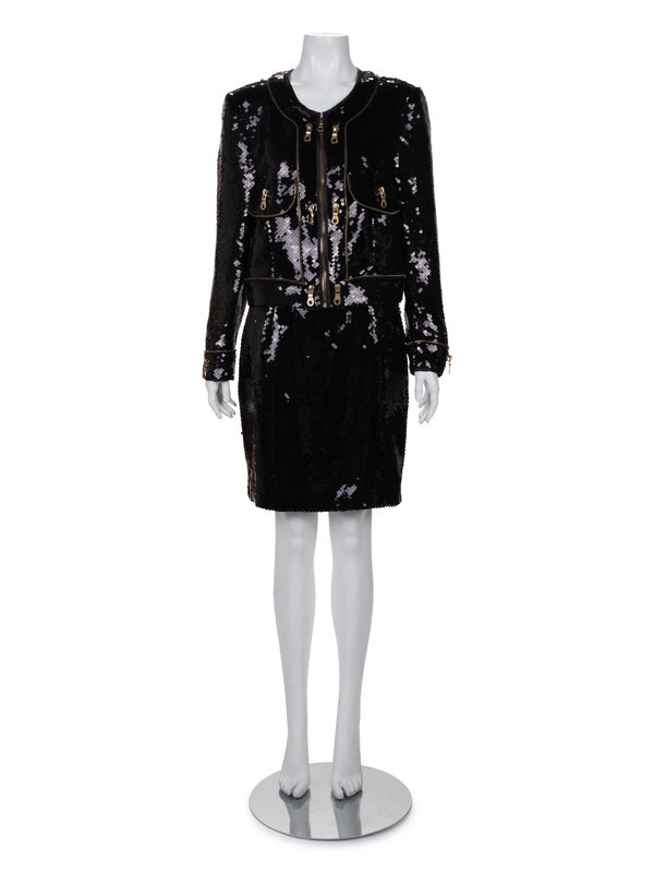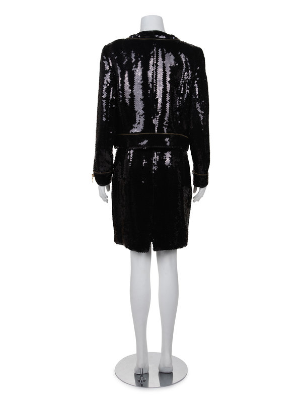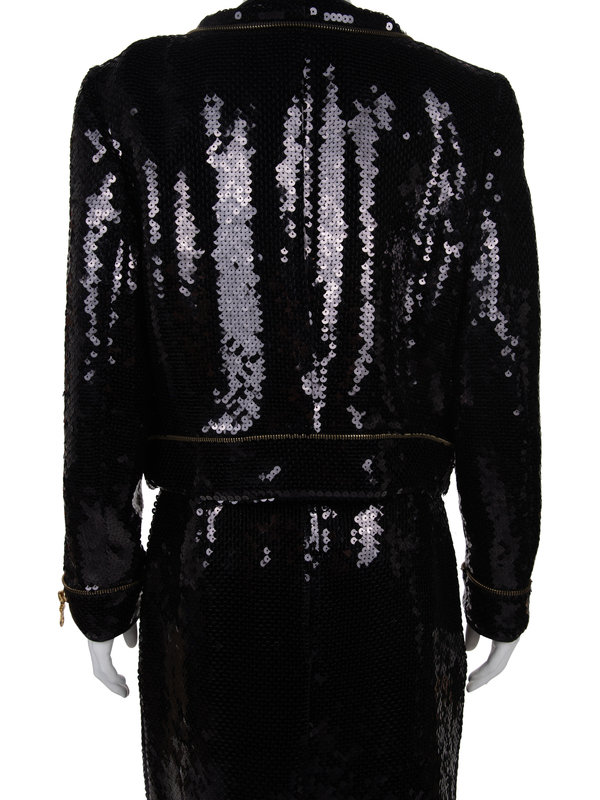 Black sequined box cut jacket detailed with brass zippers, front pouch pockets, cuffed long sleeves, and front zipper closure; paired with matching pencil skirt.