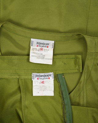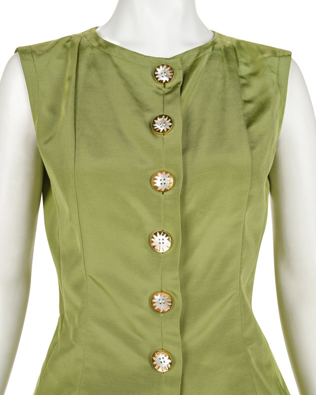 Lime green cotton-rayon blend two-piece skirt ensemble including a sleeveless button front top; paired with matching straight-fit skirt with center back zipper closure.