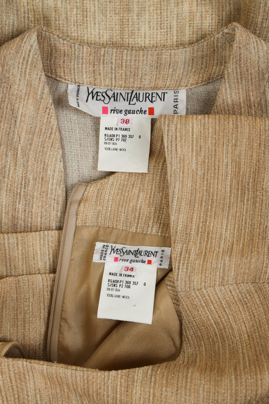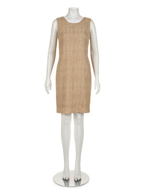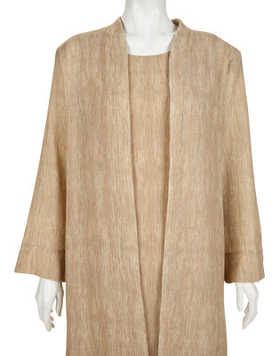 Variegated beige wool shift dress with center back zipper closure; paired with matching open front jacket.