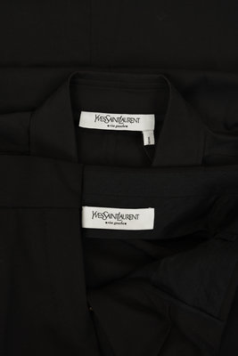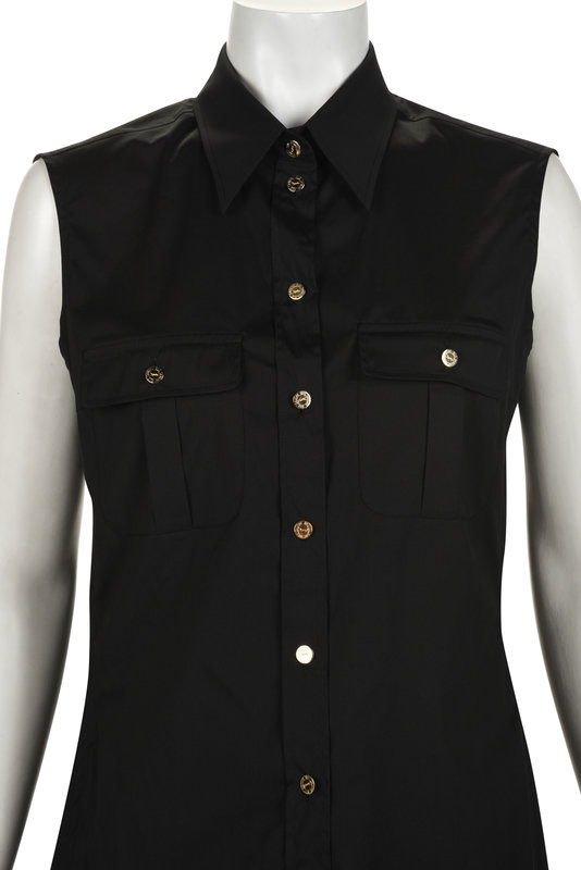 Black cotton blend two-piece pant ensemble including a pointed collar sleeveless top with patch pockets and front button closure; paired with matching pants with front fly closure.