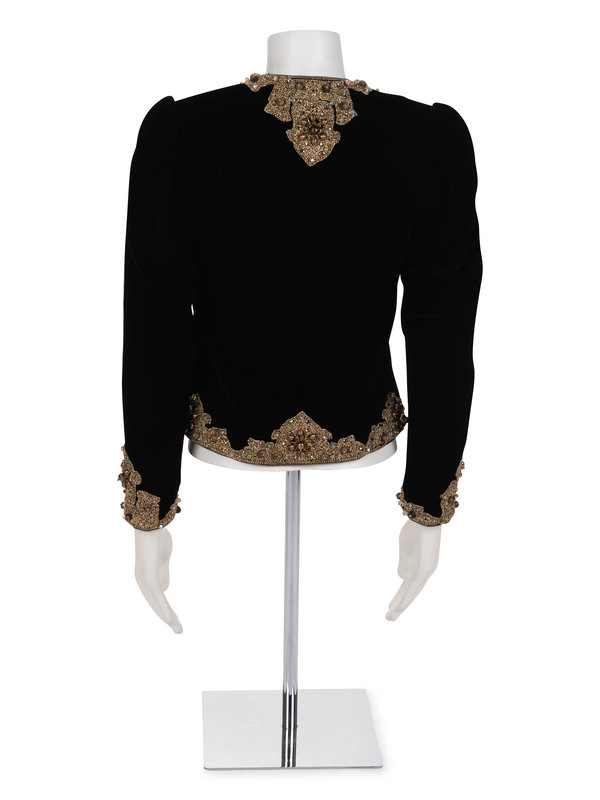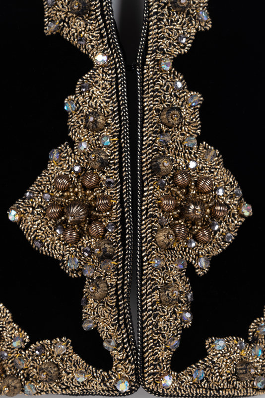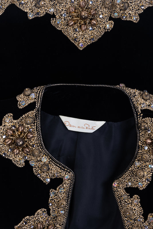 Black velvet evening jacket featuring antiqued gold-tone bead embellished appliques along neckline, sleeve hems, and bottom hemline, and front hook and eye closure.