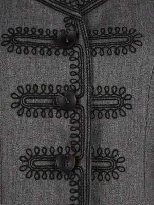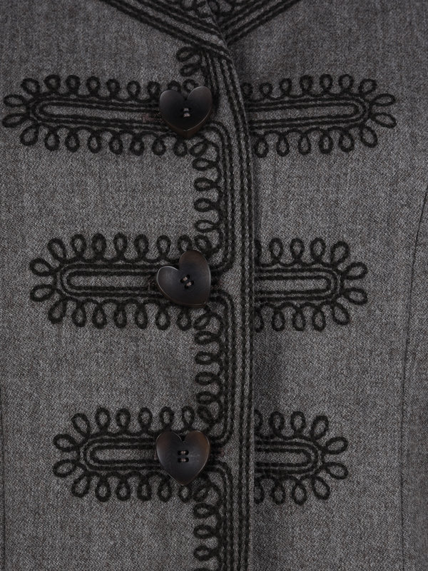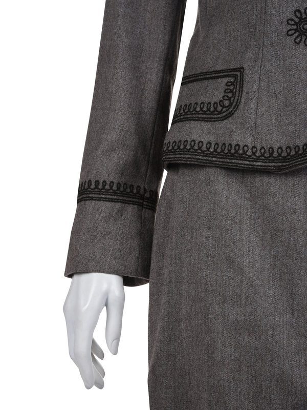 Light brown heathered wool two-piece skirt suit including a clean neckline jacket with embroidered collar, pockets, and button patterns, and front heart shaped button closure; paired with matching wool skirt with two side slits, triangular geometric embroidery, and center back zipper closure.