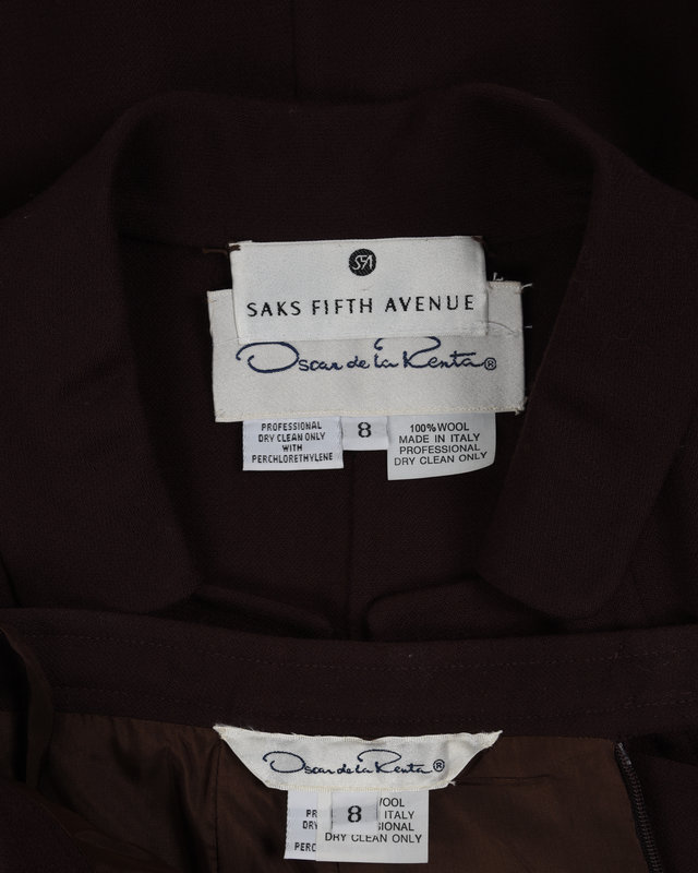 Brown wool two-piece skirt suit including a long sleeve jacket with rolled collar, front hip welt pockets, and center front button closure; paired with matching straight-fit skirt with a back zip closure.
