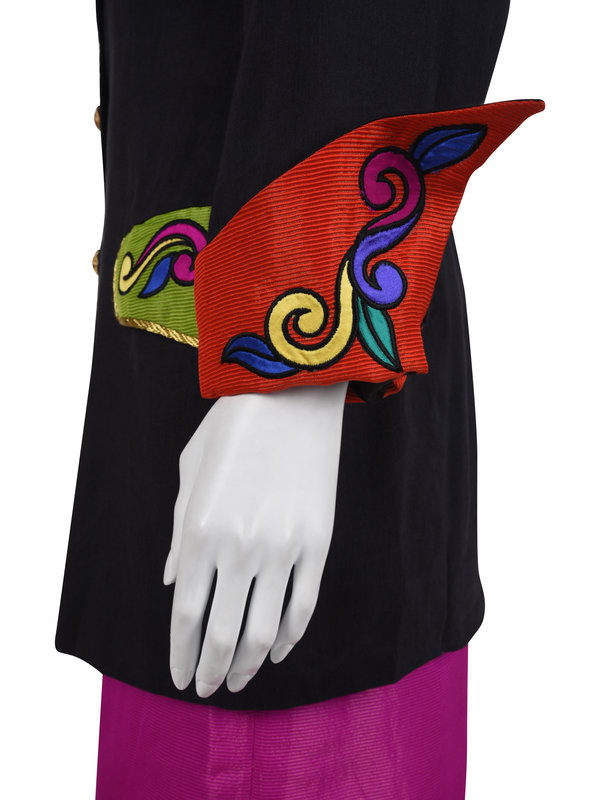 Two-piece wool/silk blend skirt suit including a dark gray long jacket with embroidered red ribbed cuffs and green pockets trimmed with gold metallic thread braid, and center front button closure; paired with a wool/silk blend and metallic thread ribbed fuchsia skirt with center back zipper closure.