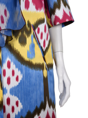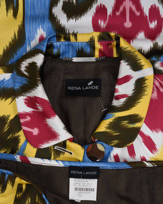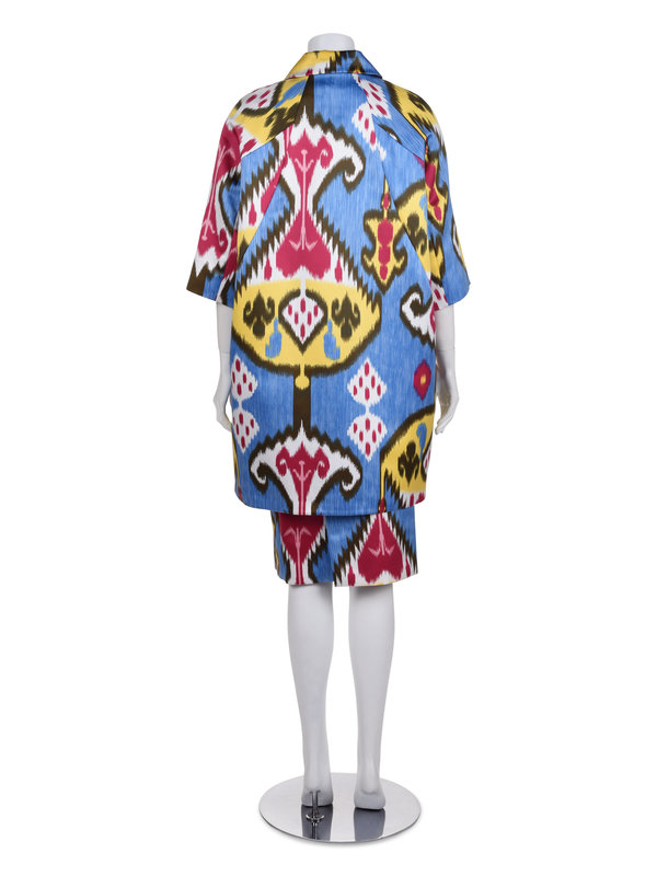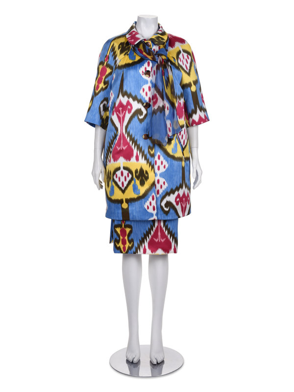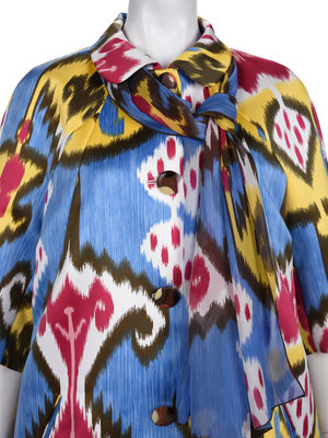 Blue, yellow, white, and pink printed silk cocoon coat with rolled collar, raglan sleeves and front button closure; paired with matching straight-fit skirt and silk chiffon scarf.