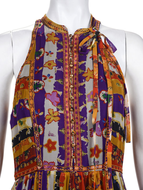 Purple, red, and yellow multi patterned floral silk sleeveless dress with banded collar, brass button down front, and full gathered skirt trimmed with embroidered ribbon, and left side zipper closure.
