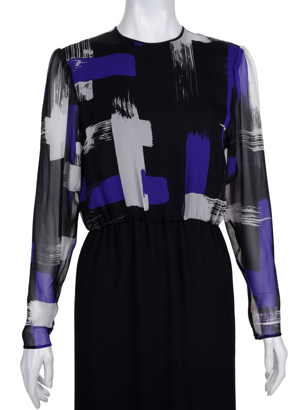 Black crepe dress with black, purple, and white printed silk chiffon long sleeve top, gathered sleeves and waist, and long straight fit skirt with back button closure.