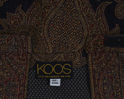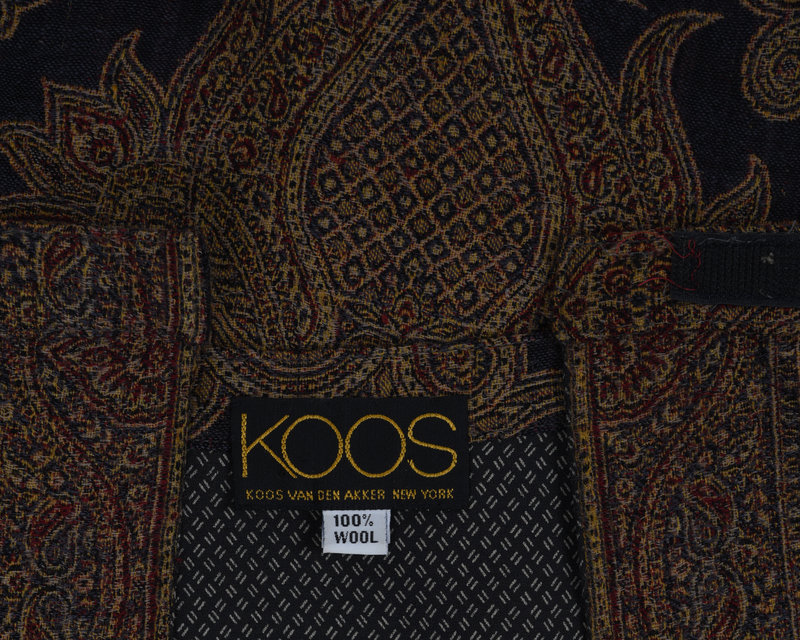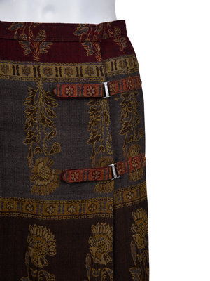 Brown and black wool paisley print wrap skirt with Velcro closures going down the left side.