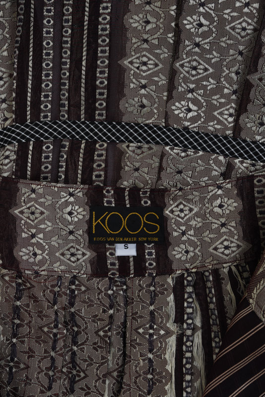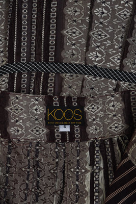 Brown and taupe pleated jacquard wrap skirt with paisley print and left side tie and zipper closure.