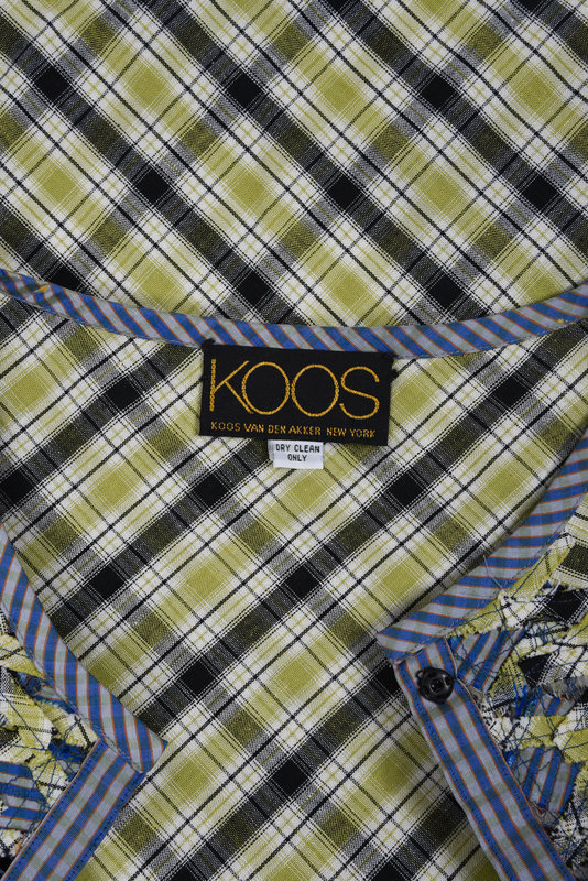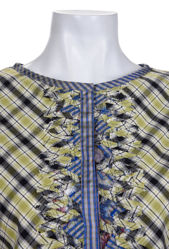 Green and black plaid button up sleeveless top with blue and orange striped edges, as well as zig-zagged design details along the front placket.