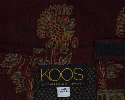 Red, black, and gray wool tapestry wrap skirt with yellow floral motif and left side Velcro tab closures.