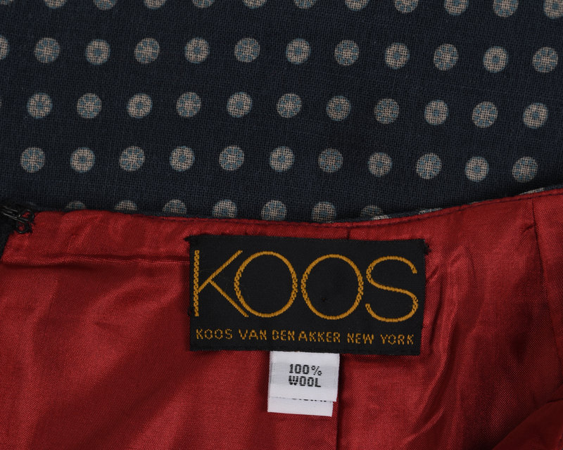 Blue polka-dot wool A-line skirt with a red lining and center back zipper closure.