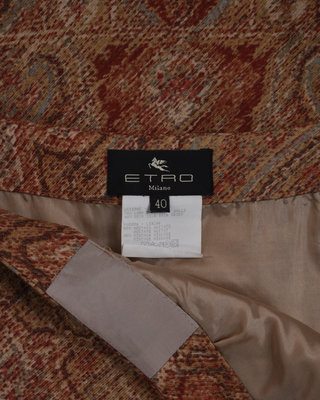 Red silk/wool blend paisley faux wrap skirt with left side front slit and left side zipper closure.