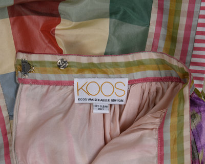 Silk taffeta pleated skirt with various plaid, gingham, and floral prints, and center back zipper closure.