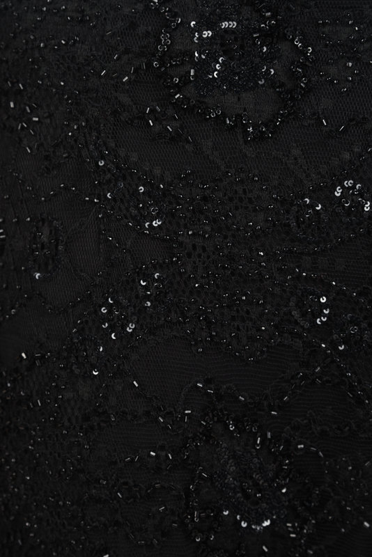 Black lace beaded straight-leg pants with venise at the hems.