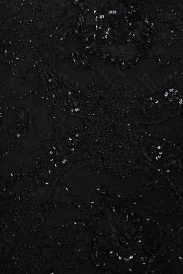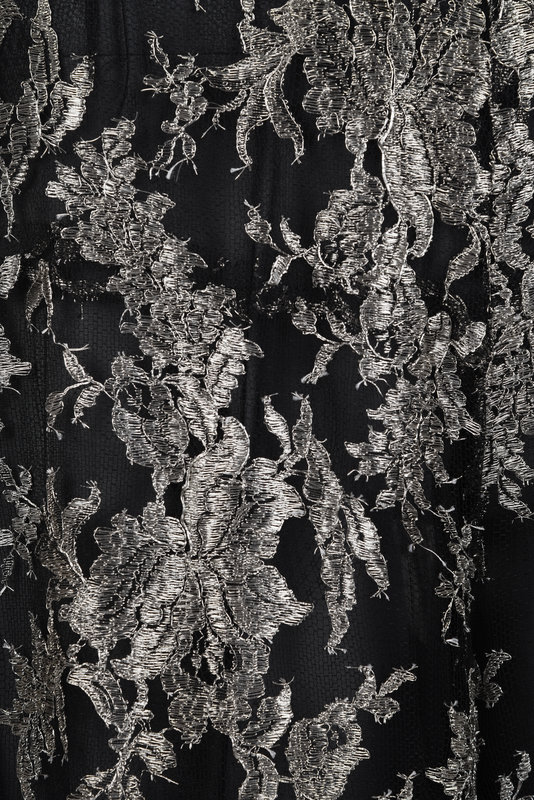 Silver thread lace on black net wide-leg pants with center back zipper closure.