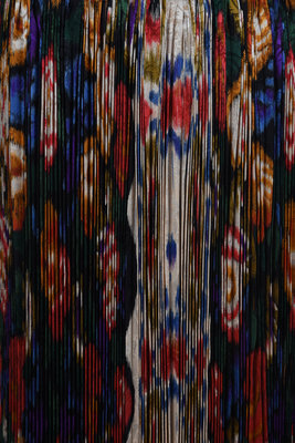 Black, tan, red, and blue paisley printed accordion-pleated rayon skirt with left side zip closure.