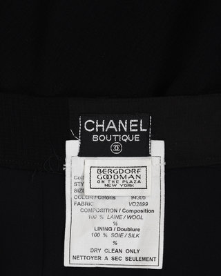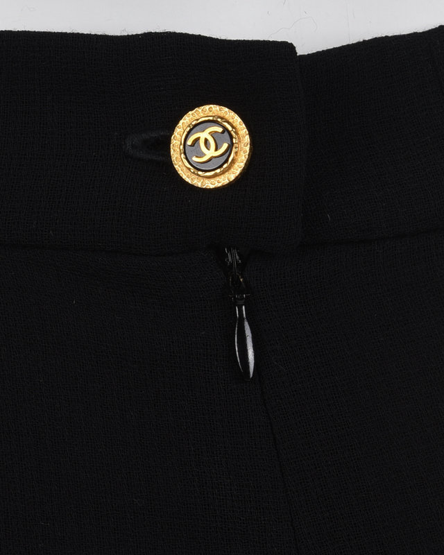 Black pleated wool skirt with a drop hem and a side zip closure with a gold Chanel button.