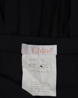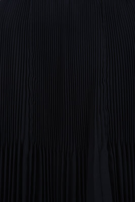 Black polyester pleated ankle-length, polyester skirt with a side zip closure with a decorative button.