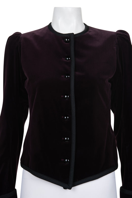 Purple silk velvet jacket trimmed with black braided trim, jewel neckline, pleated long sleeves with cuffs, and front button closure.