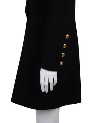 Black wool crepe double-breasted coat with shawl collar, welted front pockets, and front button closure.