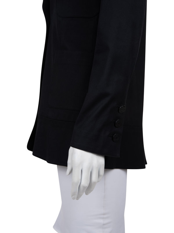 Black cotton twill jacket with peak lapels, four front patch pockets, and front button closures. Spring 2003.