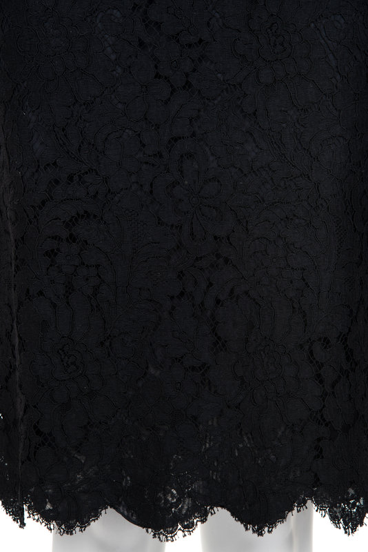 Black polyester/viscose blend lace skirt with scalloped hem and center back zipper closure.