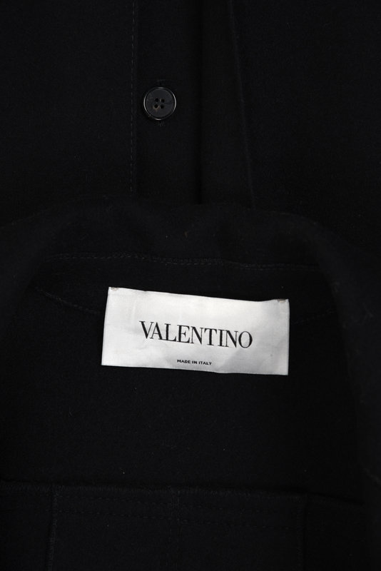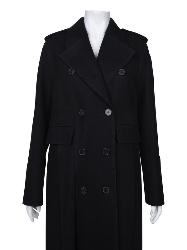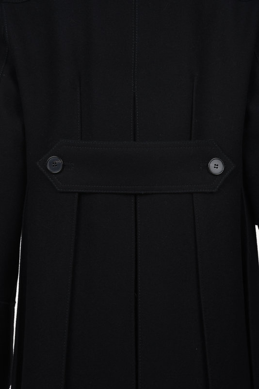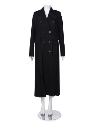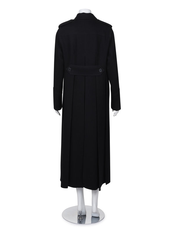 Black wool double breast coat with rolled collar, shoulder epaulets, waist flap pockets, pleated skirt, and front button closures.