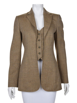 Tan tweed single notched lapel jacket with attached vest and front button closure.