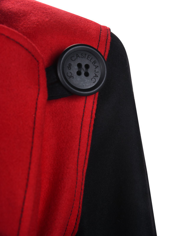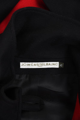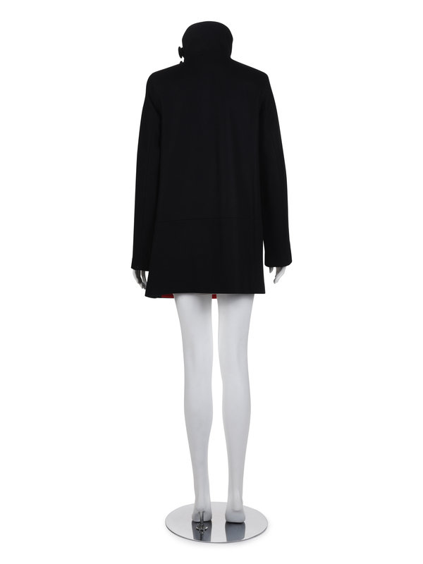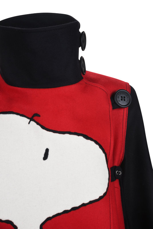 Black wool/cashmere blend coat with embroidered Snoopy on red front panel, banded collar with two-button closure, in-seam slip pockets, and left side button closure.
