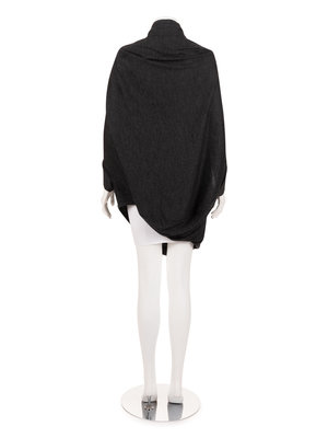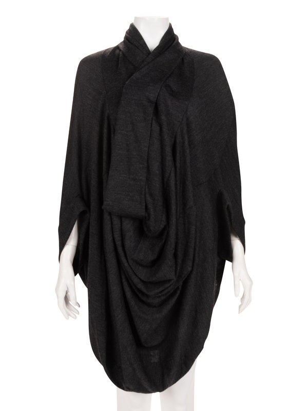 Dark gray wool knit draped convertible tunic with collar snap closures and rolled banded sleeves.