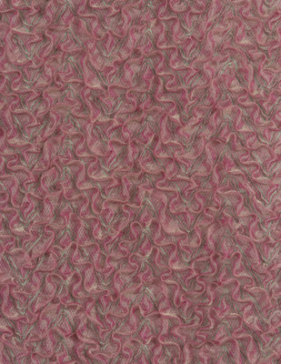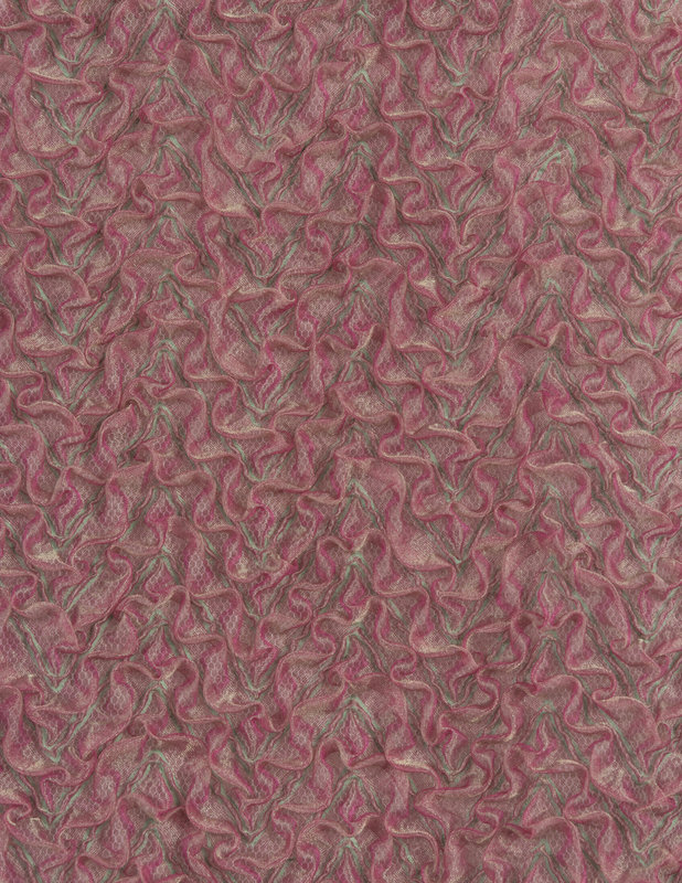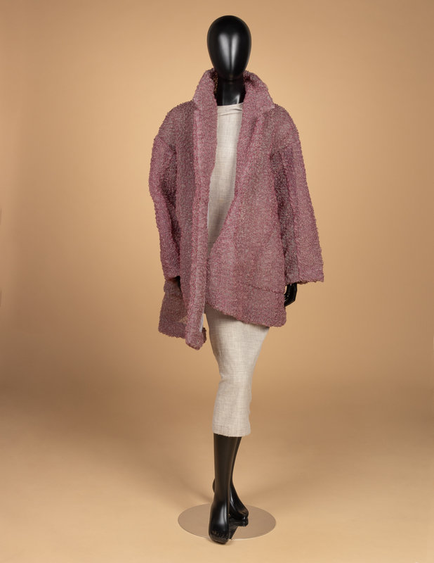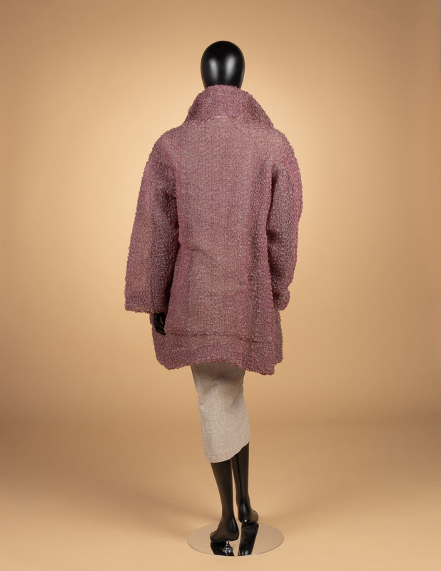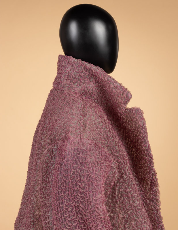 Pink polyester iridescent organza pleated jacket with turquois painted chevron pattern, rolled collar, straight tubular sleeves, and wide sweeping hemline.
