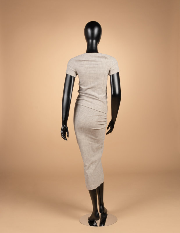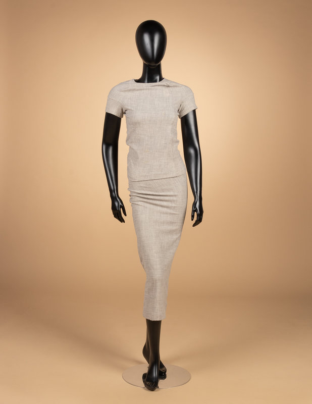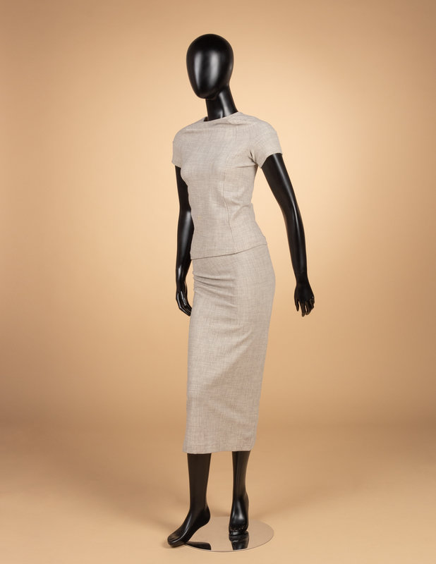 Beige wool/nylon blend knit ensemble with short sleeve blouse with box shaped seam details along upper chest and matching semi-curved cut knit skirt.
