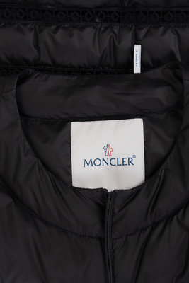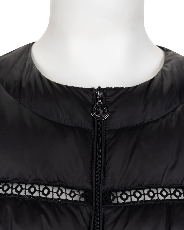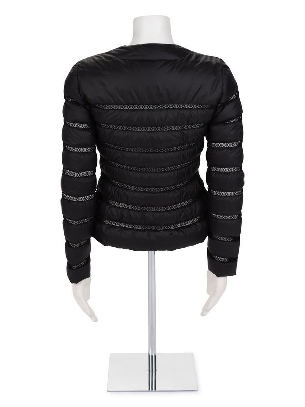 Black polyester down feather puff jacket with black thread ring ribbon inserts, with jewel neckline, front zipper waist pockets and center front zipper closure.