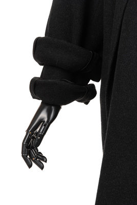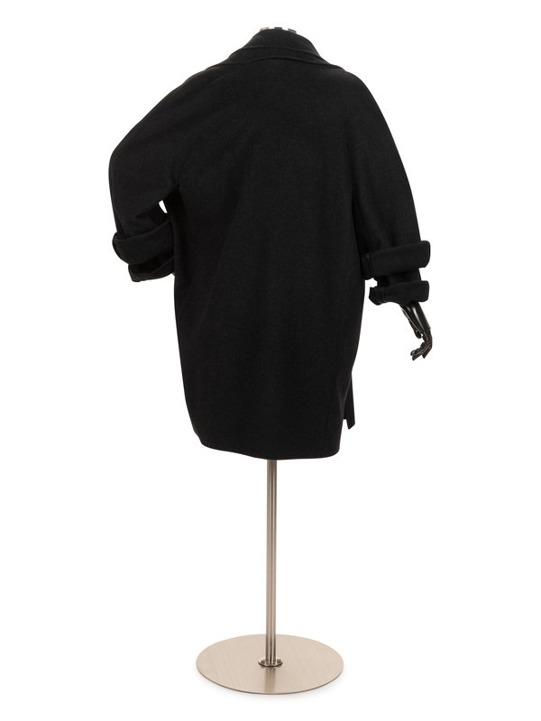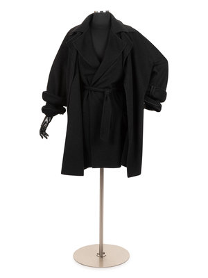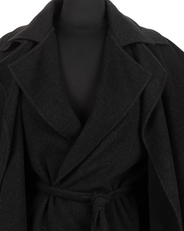 Charcoal gray cashmere double layered jacket with rolled collar and single notch lapel, inner jacket patch pockets, tie belt, and attached by single button at back neckline.