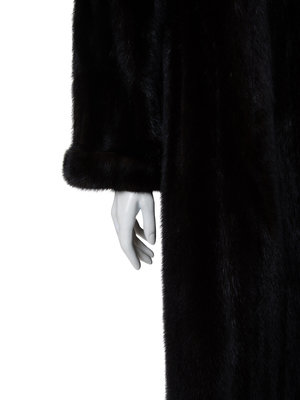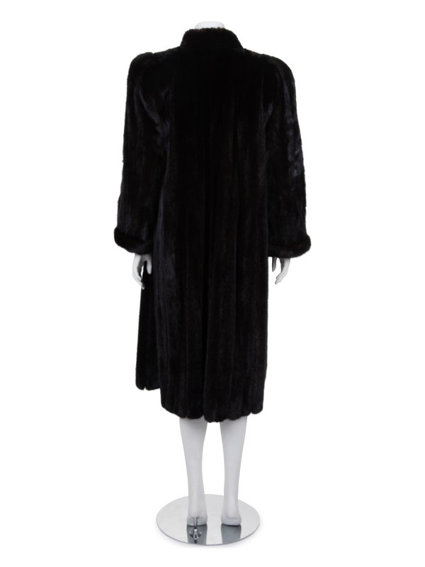 Dark brown/black mink fur coat with banded collar, set in full pleated shoulders into cuffed long sleeves, inseam slit pockets, and front spring clasp hook and eye closure.