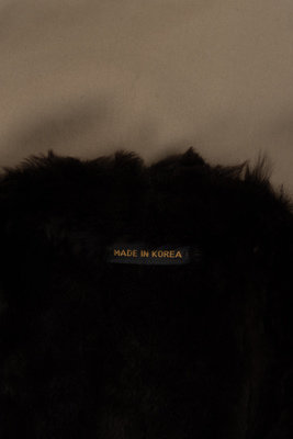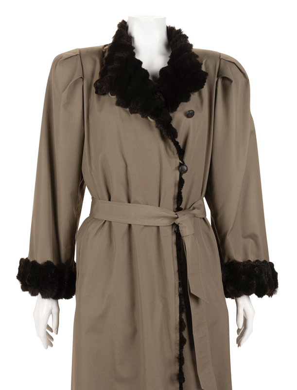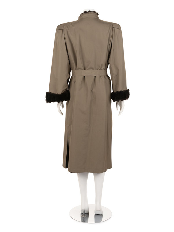 Khaki polyester/cotton blend storm coat lined with brown sheared mink fur, band collar, padded shoulders with pleated cap sleeves, front welt pockets, and front button and tie belt closure.