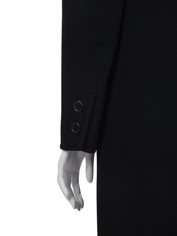 Black wool long coat with shawl collar, three front flap pockets, and front two button closure.