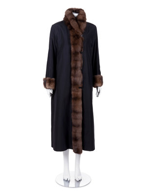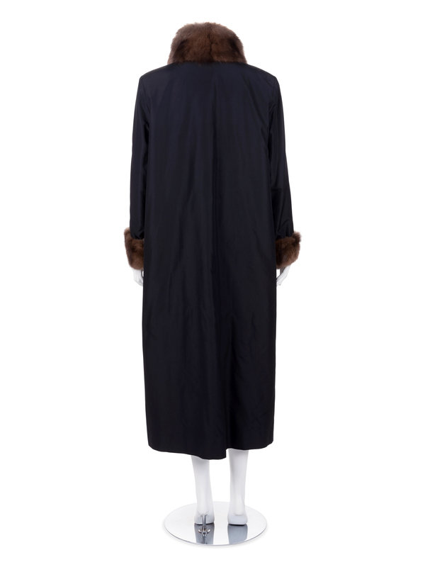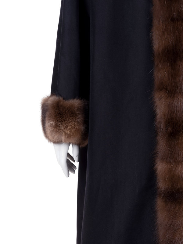 Brown sable fur trimmed black coat with detachable black sheared and grooved mink fur lining, set in shoulder into long sleeve, side welt pockets, and front button closure.