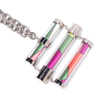 Silver-tone chain necklace with three clear plastic vials containing Commessa printed silk rolls pendant. Found with original sales tag, listed price is missing. Dust bag and box included.