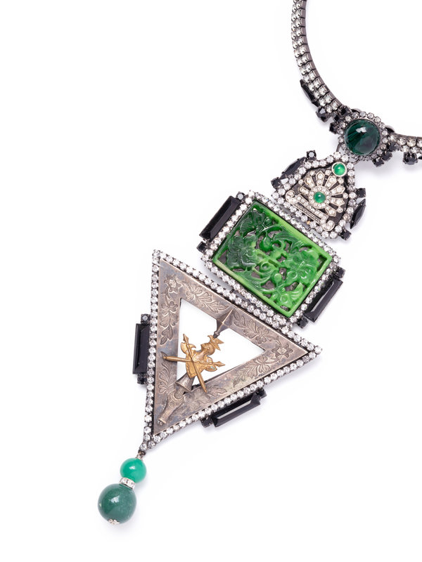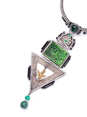 Dark metal choker necklace set with clear and black rhinestones, green cabochons, and etched silver-tone inverted triangle with brass coat-of-arms pendant.