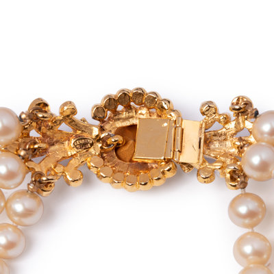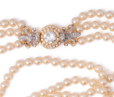Three strand faux pearl necklace with clear rhinestone set into gold-tone metal fleur de lis pressure clasp.