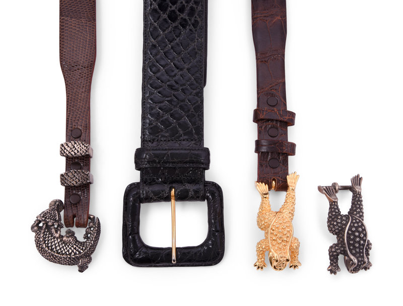 Brown alligator skin belt with a gold-tone frog buckle. 1991.
