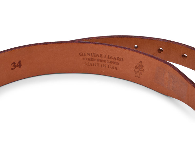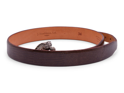 Brown lizard skin belt with a Sterling silver horned lizard buckle.
