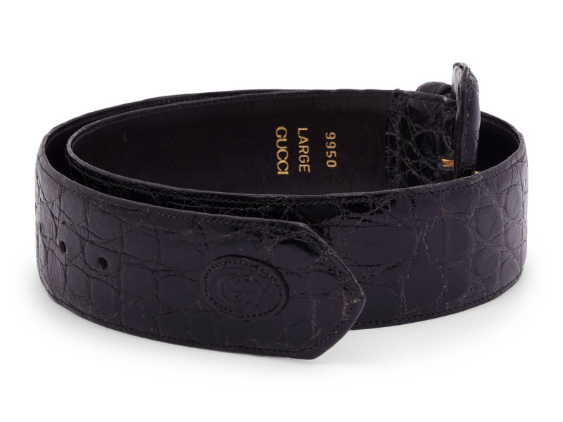 Black alligator skin belt with square buckle.